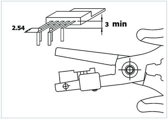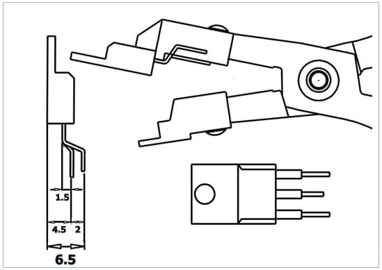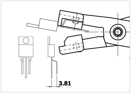 Pinza speciale che con una sola operazione permette di piegare a 90° il componente TO220 (3 gambini) in modo tale che il gambino centrale risulti più lungo di 3.81mm rispetto ai gambini laterali. È possibile regolare la distanza per mezzo di una lamina registrabile (min. 3mm).