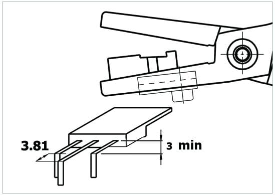 Special pliers designed to bend the TO220 component leads (3 leads) to 90° in one step, in such a way that the central lead is 3.81 mm longer than the side leads. The forming length can be adjusted using the adjustable stop (min. 3 mm).