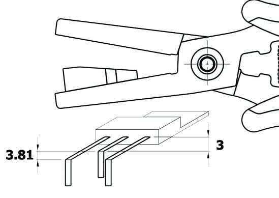 Special pliers designed to bend the TO220 component leads to 90° in one step, in such a way that the central lead is 3.81 mm shorter than the side leads. The forming length can be adjusted using the adjustable stop (min. 3 mm).