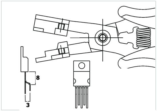 Utensile speciale studiato per la preformatura dei gambini 2-4 a passo 3mm del componente TO220 (5 gambini).